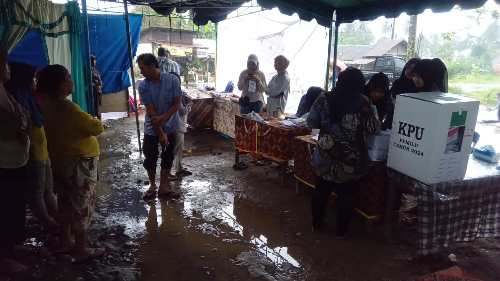 Hujan lebat mengguyur di saat proses pemungutan suara pemilu 2024 sedang berlangsung, beberapa lokasi Tempat Pemungutan Suara ( TPS ) yang memakai tenda bocor tersiram air hujan menjadi becek berair, Rabu ( 14/2/2024 ), Sekitar pukul 09.30 Wib, di Kelurahan Pekan Gebang, Kecamatan Gebang, Kabupaten Langkat, Sumut.