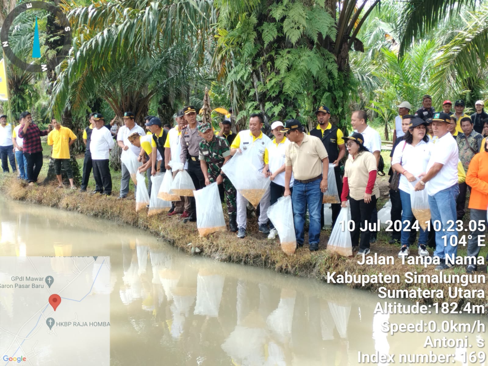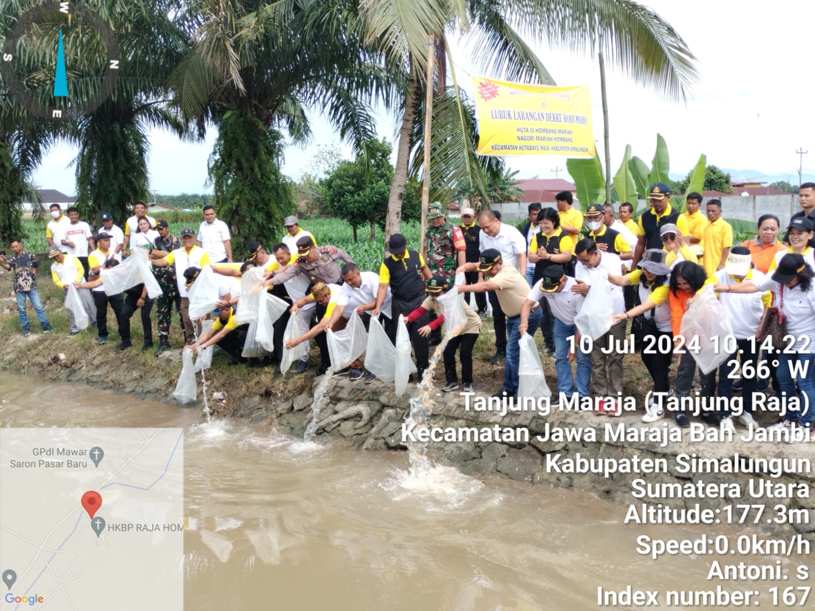 SIMALUNGUN – Bupati Simalungun Radiapoh Hasiholan Sinaga, Ketua TP- PKK Kabupaten Simalungun Ratnawati Sidabutar, OPD dan Pangulu Nagori Mariah Hombang Mendra Siregar tabur benih ikan di Lubuk Larangan Dekke Rodimaho di Huta III (tiga) Dusun Hombang Mariah, Nagori Mariah Hombang, Kecamatan Hutabayu Raja, Kabupaten Simalungun. Rabu (10/07/2024).