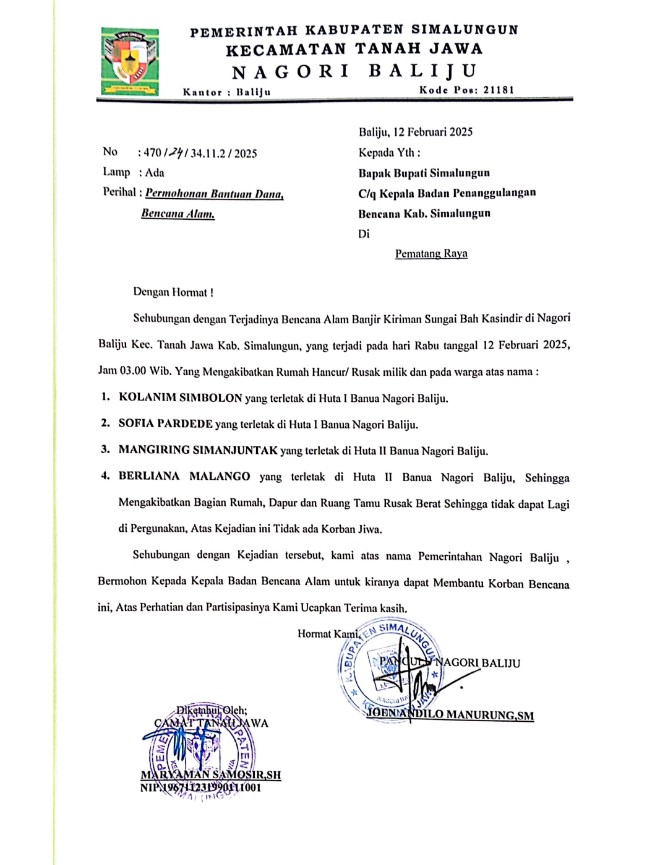 Menggapai permasalahan yang disampaikan Pangulu Baliju, Awak media ANEWS-Chanel menghubungi Camat Tanah Jawa Maryaman Samosir, sembari bertanya terkait surat pemberitahuan masalah bencana banjir di Baliju yang kirim ke Dinas Sosial dan BPBD.