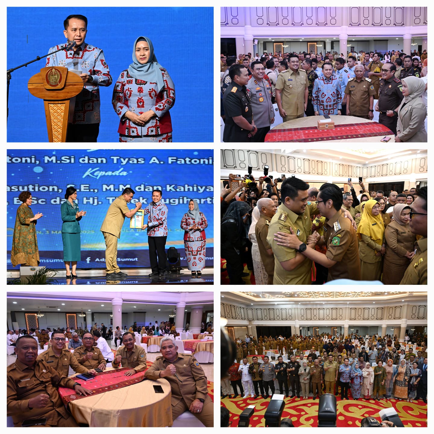 FOTO : Gubernur Sumatera Utara (Sumut) Muhammad Bobby Afif Nasution bersama Ketua TP PKK Sumut Kahiyang Ayu didampingi Wakil Gubernur Surya, Pj Sekda Sumut Effendy Pohan, Pj Gubernur Sumut Agus Fatoni, serta Pj Ketua TP PKK Sumut Tyas Fatoni, saat pisah sambut dan serah terima jabatan Gubernur dan Wakil Gubernur Sumut, serta Ketua TP PKK Sumut di Aula Raja Inal Siregar, Kantor Gubernur, Jalan Diponegoro 30, Medan. Hadir pada kesempatan tersebut istri Wakil Gubernur Surya, Titiek Sugiarti, Kapolda Sumut Irjen Pol Whisnu Hermawan Februanto, Pangdam I/BB Rio Firdianto, Kajati Sumut Idianto, dan unsur Forum Koordinasi Pimpinan Daerah (Forkopimda) lainnya. Juga hadir Walikota Medan Rico Waas, Wakil Walikota Binjai Jiji, serta Bupati Pakpak Bharat Franc Benhard Tumanggor.