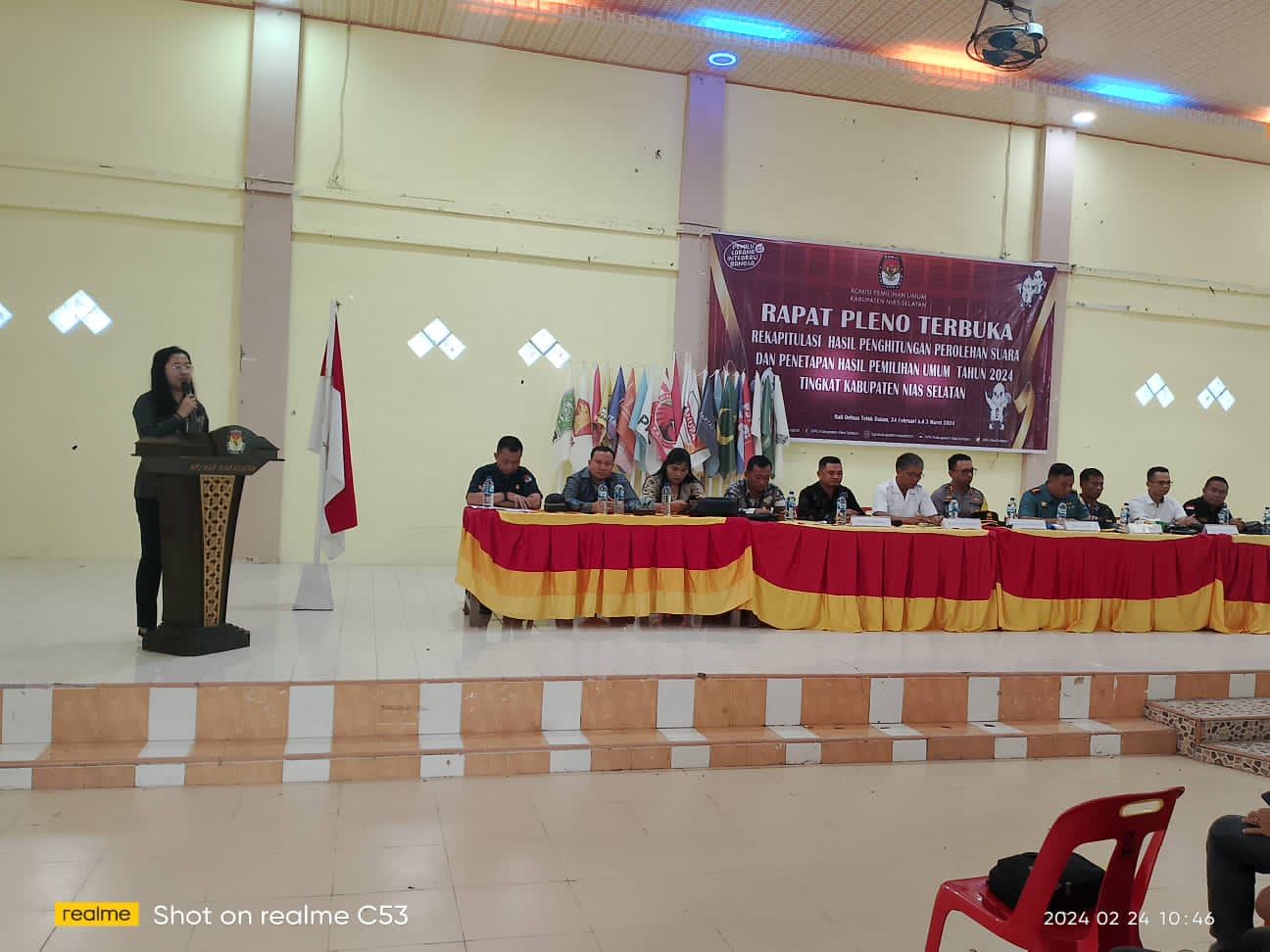 Kami dari KPU Kabupaten Nias Selatan memohon maaf dan pengertian dari seluruh hadirin bahwa tahapan pelaksanaan pleno kecamatan memutuskan untuk memulai pleno hari ini pertanggal 24 Februari 2024.