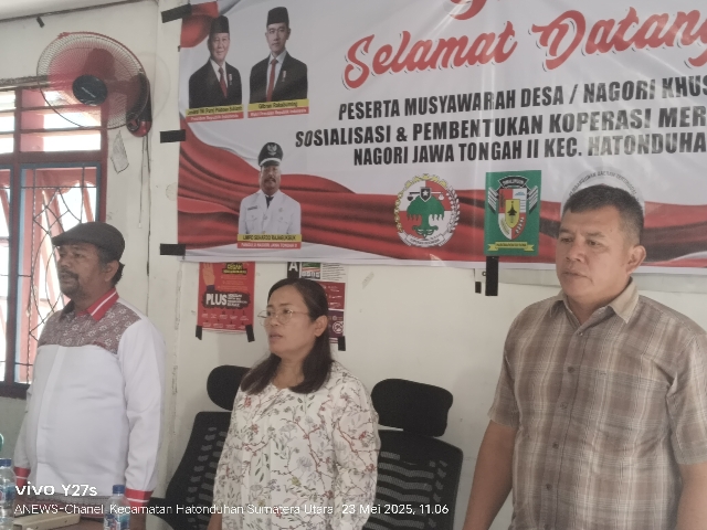 SIMALUNGUN – Pada Jumat, 23 Mei 2025, Pemerintah Nagori Jawa Tongah II, Kecamatan Hatonduhan, Kabupaten Simalungun, menyelenggarakan Musyawarah Nagori Khusus untuk pembentukan Koperasi Merah Putih. Acara ini dihadiri oleh berbagai pihak, termasuk perwakilan Camat Hatonduhan (Ibu Duma Naibaho, Kasi Pem), Pangulu Jawa Tongah II (Bapak Limpo Suhardo Rajagukguk), Sekretaris Desa, perangkat nagori, Pendamping dan Kordinator Desa (Ibu Supiani), Babinsa (Sertu P. Sinaga), Bhabinkamtibmas (Aiptu R.H. Sianturi), tokoh masyarakat, dan puluhan warga setempat.