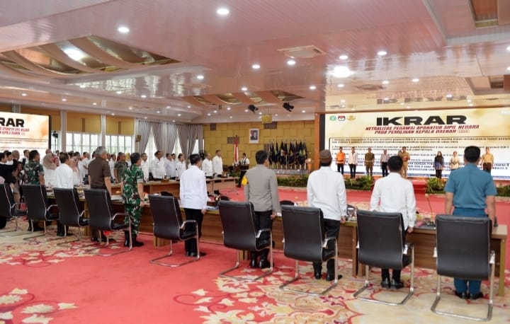 FOTO: Pj. Gubernur Sumatera Utara (Sumut) Agus Fatoni beserta Forkopimda Sumut melakukan Deklarasi Netralitas ASN Se-Sumut sekaligus memimpin Rapat Koordinasi Pemilihan Kepala Daerah di Aula Tengku Rizal Nurdin Jalan Sudirman Kota Medan, Rabu (23/10). Deklarasi tersebut diikuti oleh ASN di lingkungan Pemerintah Provinsi dan Kabupaten/Kota se-Sumut.