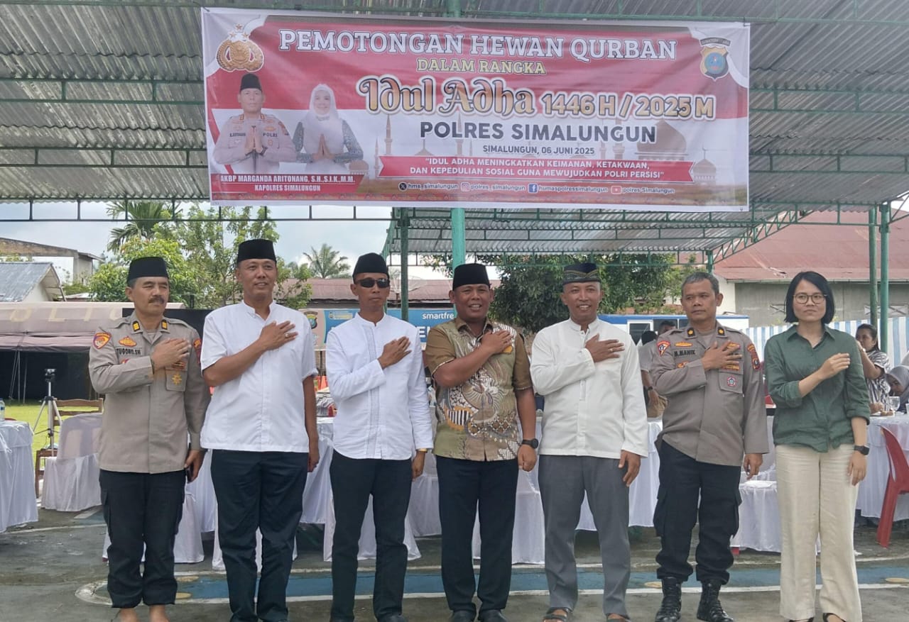 ANEWS-Chanel : Simalungun – Dalam rangka memperingati Hari Raya Idul Adha 1446 H/2025 M, Polres Simalungun menggelar kegiatan penyerahan dan pemotongan hewan kurban di halaman Kantor SATPAS Satuan Lalu Lintas Polres Simalungun, Jumat (5/6/2025). Kegiatan ini merupakan wujud nyata implementasi program “Polri Untuk Masyarakat” dan Polri Presisi yang mengedepankan kepedulian sosial.