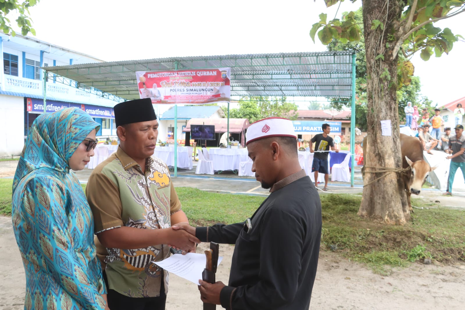 Kapolres Simalungun secara simbolis menyerahkan hewan kurban kepada Ustadz Zainal Abidin untuk disembelih sesuai syariat Islam. Sebanyak 17 ekor hewan kurban, terdiri dari 12 sapi dan 5 kambing, dipotong dan didistribusikan kepada berbagai pihak.