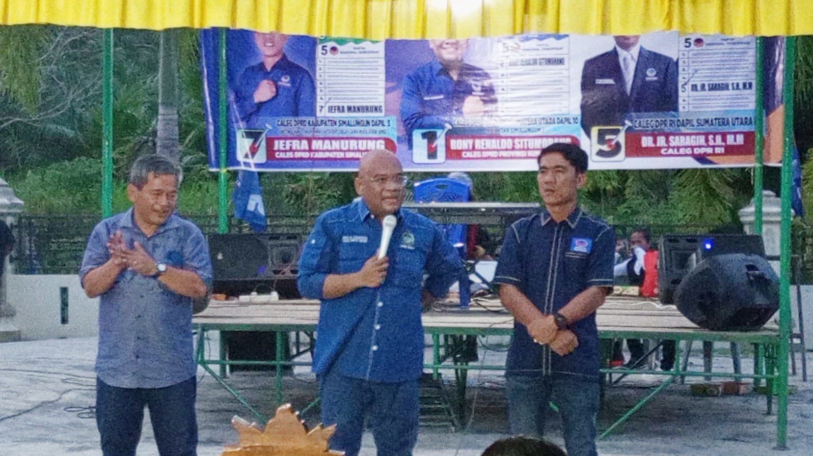 Sementara itu, Rony Situmorang Caleg DPRD Provinsi dengan penuh semangat menimpali penyampaian Jefra Manurung, dari informasi lembaga survei Partai Nasdem akan menjadi pemenang di Kabupaten Simalungun, jika itu benar, harapan kita Saudara Jefra Manurung mendapatkan suara tertinggi sehingga berhak menjadi Ketua DPRD Simalungun, setuju….! Teriak Rony Situmorang…. Para Pendukung yang hadir menjawab…. Setuju….. Seraya bertepuk tangan.