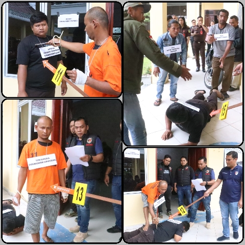 Sebanyak 15 adegan berdarah diperagakan oleh tersangka dan saksi untuk memperjelas kronologi pembunuhan berujung maut yang dipicu pertengkaran sepele di sebuah warung tuak.